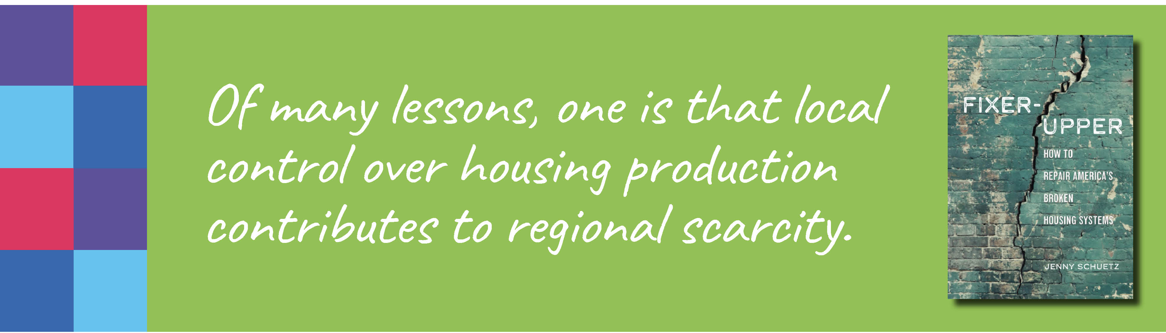 Schuetz, J. (2022). Fixer-Upper: How to Repair America’s Crumbling Housing Policies. Brookings Institution Press.