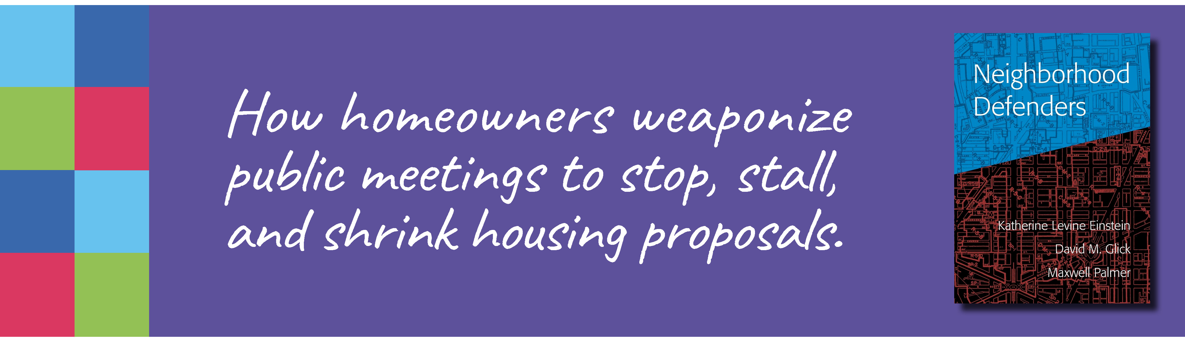 Einstein, K. L., Glick, D. M., & Palmer, M. (2019). Neighborhood Defenders: Participatory Politics and America’s Housing Crisis. Cambridge University Press; Cambridge Core.